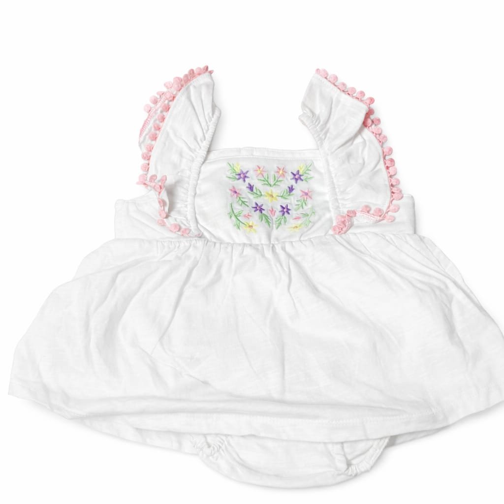 This adorable baby dress comes in a soft, pure White shade, designed to bring out gentle elegance and comfort. Featuring delicate multicolor floral embroidery on the bodice, it adds a cheerful touch while keeping a minimal, classy look.