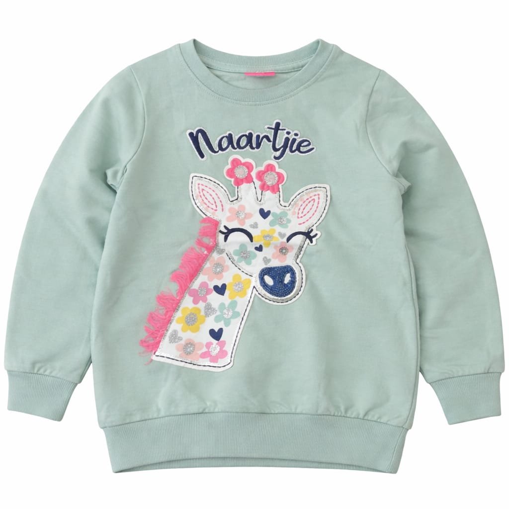 Add playful charm to your little one’s wardrobe with this soft Green kids sweatshirt. Designed with an adorable giraffe applique featuring colorful floral prints and textured detailing, this top brings fun and comfort together.
